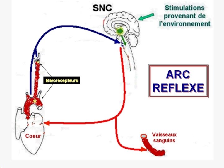 A. Contrôle nerveux = la régulation réflexe • Sollicité en permanence, assure la constance de la PA en jouant sur le débit cardiaque et les RVT • Son mode d’action fait intervenir des modifications instantanées : – FC – Tonus vasomoteur périphérique.