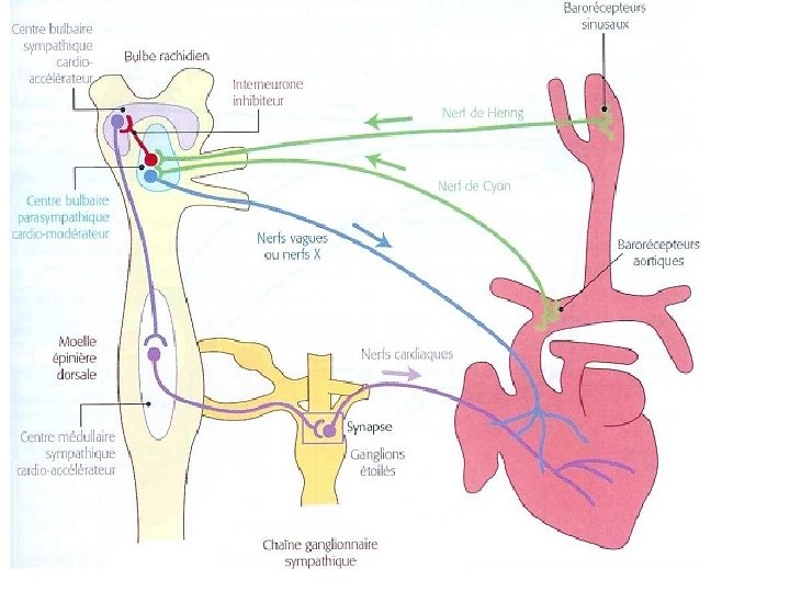 • Il est en relation étroite avec : – Le centre cardioinhibiteur (= dépresseur) qui correspond au noyau dorsal du X. De ce centre partent les fibres parasympathiques cardiomodératrices destinées au cœur (↓FC). – Le centre vasomoteur et cardioaccelerateur (presseur) De ce centre partent les voies efférentes sympathiques qui empruntent la ME entre D 1 et D 4 et destinées au cœur (↑ FC et inotropisme) et aux vaisseaux de façon généralisée.