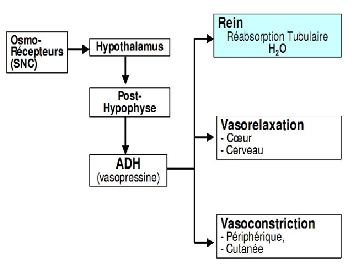 L’ADH • Hormone peptidique post hypophysaire (sécrétée par les noyaux SO et PV de l’hypothalamus et stockée dans des granules sécrétoires dans la post hypophyse) • Agit sur le rein : augmente la perméabilité à l’eau libre du tube collecteur avec réabsorption hydrique (urines concentrées). A très forte dose, elle a un effet vasoconstricteur.
