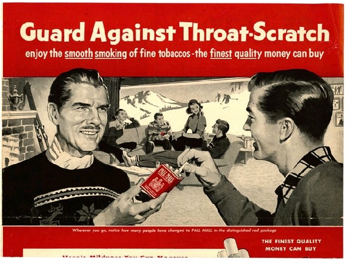 Pathos: Everyone shown in this image is smiling. Happiness seems to surround them as they sit together in what seems to be a ski lodge. They are dressed warmly and are sitting near a glowing fireplace. The red of the cigarette package stands out against the black and white image—this seems to suggest that the owner of the cigarettes might also “distinguish” himself (or stand out from the crowd) by owning the cigarettes. Loaded words like “smooth, ” “finest quality, ” “distinguished, " and “finest money can buy” suggest wealthy and upper class living. Ethos: Pall Mall attempts to give their argument credibility by showing us a picture of one man offering the cigarettes to another. The man offering the cigarettes seems slightly older than the man receiving the cigarettes, maybe suggesting that the older man’s experience qualifies him to make a recommendation. Logos: Interestingly, there is little or no evidence of a logical appeal, although the words, “guard against throat scratch” seem to suggest that smoking other brands will cause your throat to scratch.