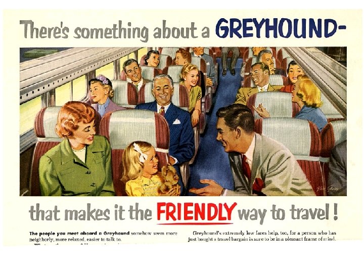 Pathos: As in the other advertisement, everyone shown in this image is smiling. Happiness seems to surround them as they sit together in the seats of a Greyhound bus. Everyone is formally dressed and neatly groomed. “The friendly way to travel” suggests that driving in a car, or riding your bike, are more aggressive. The ad also states, “The people you meet aboard a Greyhound somehow seem more neighborly, more relaxed, easier to talk to. ” In fact, it looks like this group of people could have come from the same neighborhood. Ethos: The ethical appeal is harder to see. Greyhound seems to be relying on the credibility of it’s name, and it’s presentation as a safe and clean environment in the advertisement. Logos: Greyhound uses it’s low fares as evidence to support the passenger’s friendly attitude: “a person who has bought a travel bargain is sure to be in a pleasant frame of mind. ” They don’t offer any specific pricing information, however.