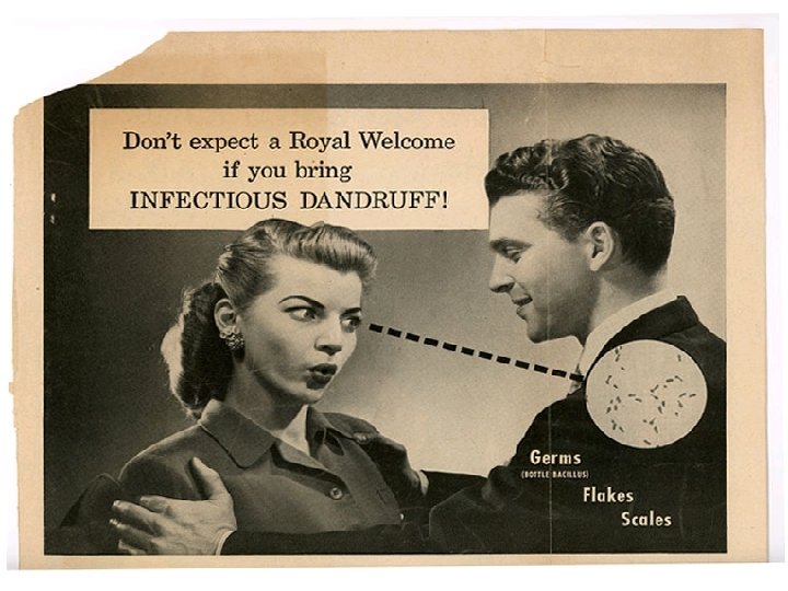 Pathos: The man appears to be in the role of the husband returning home to his wife after a long day of work. He reaches for her, hat in hand, and instead of the “royal welcome” he expects, the man is greeted by the scrutinizing stare of his wife, whose expression seems to communicate suspicion, anxiety and possibly disgust. The font exclaims: “INFECTIOUS DANDRUFF!” Infectious is a loaded or emotional word that carries a negative connotation similar in tone to the expression on the woman’s face. Ethos: The ethical argument is harder to see and seems connected to the pseudoscience (false scientific facts and information) pictured on the man’s shoulder. Logos: The close-up image of the germs, flakes, and scales pictured on the man’s shoulder attempt to create a sense of scientific evidence, although they ultimately come across as specious.