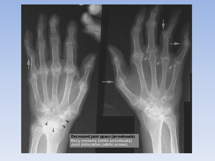 RA - prognosis • Two general categories: 1) 5 -20% have intermittent disease with periods of exacerbation and a relatively good prognosis; 2) 80 -85% have progressive disease with either a slow or rapid course: 50% of patients will be functional class 3 or 4 within 10 years; 30% of patients will be unemployed at 5 years; • Higher incidence of infections, cardiovascular disease and lymphoma.