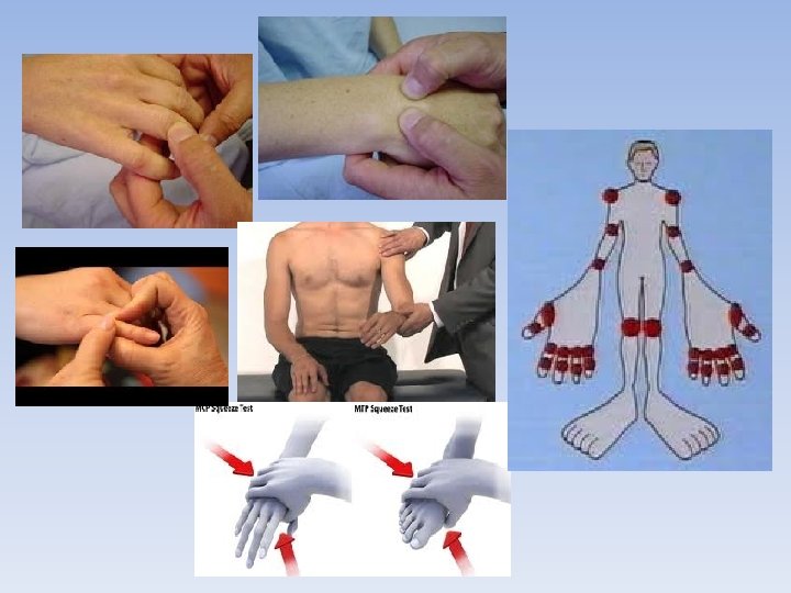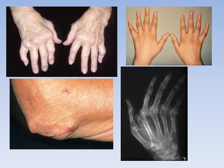 RA – physical examination • Musculoskeletal: PIPs (proximal interphalangeal joints)– fusiform swelling, pain, tenderness to palpate, flexion deformities, swan-neck deformities, boutonniere deformities, ligamentous instability, rheumatoid nodules; MCPs (metacarpophalangeal joints)– swelling, pain, tenderness to palpate, flexion deformities, ulnar drift and subluxation; Thumbs – Z deformity; Wrists – dorsal swelling, pain, tenderness, radial deviation, volar subluxation carpal tunnel syndrome and interosseous wasting; flexor tendon thickening with nodules