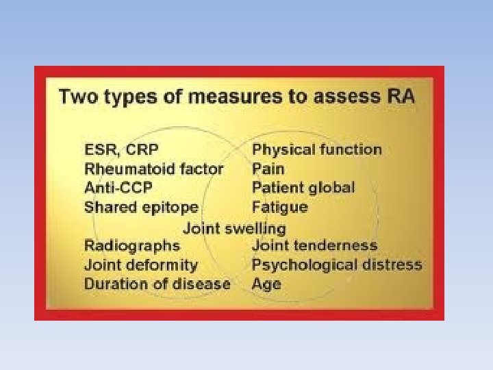 Disease activity classification – DAS 28 • Swollen and Tender joint count (28 joints) • ESR / CRP • VAS – patient’s disease acivity assesment (0 -100 mm) • REMISSION : DAS 28< 2. 6 • LOW ACTIVITY: DAS 28=2. 6 -3. 2 • MODERATE ACIVITY: DAS 28=3. 2 -5. 1 • SEVERE ACTIVITY: DAS 28>5. 1