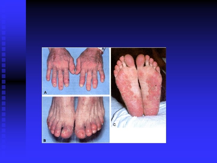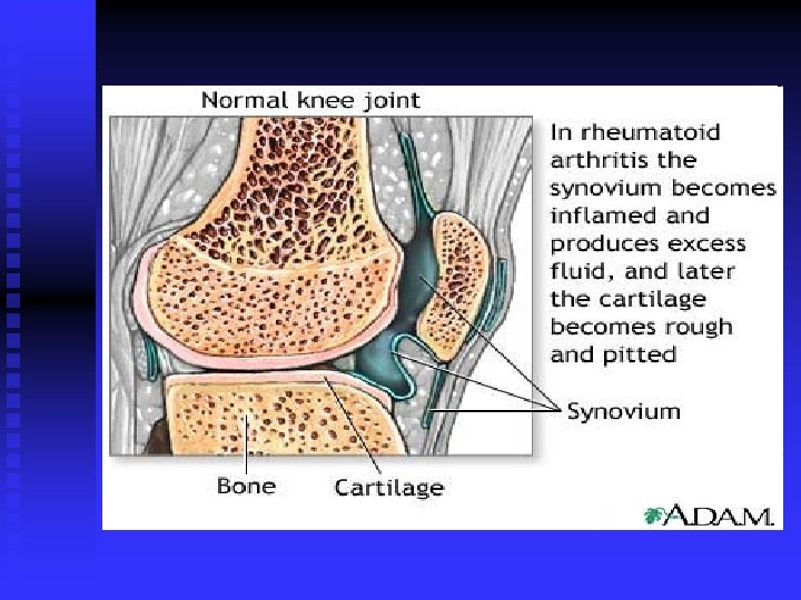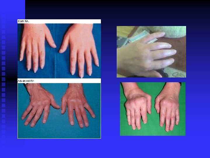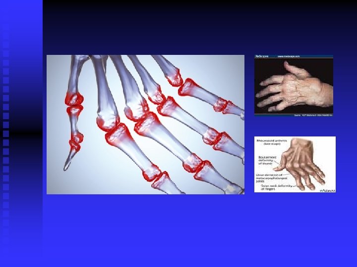 Rheumatoid arthritis n n n n Chronic systemic disease Prevalence 1% More common in women, women: men 3: 1 autoimuniy disease- production of rheumatoid factor – antibody agains human Ig. G synovitis, deformity, destraction, instability, subluxatio symetrical involvement of periferial joints possibility of involvement of all joints in the body