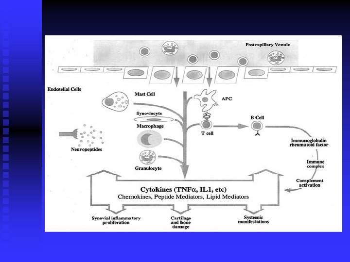 Pathogenesis of RA unknown n Multifactorial: genetic: associátion with specific type of n HLA (HLA DR-4) pro-inflammatory cytokines: TNF alfa, IL-17, IL-1, IL-6 hormonal factors: prolactine, lack of testosterone