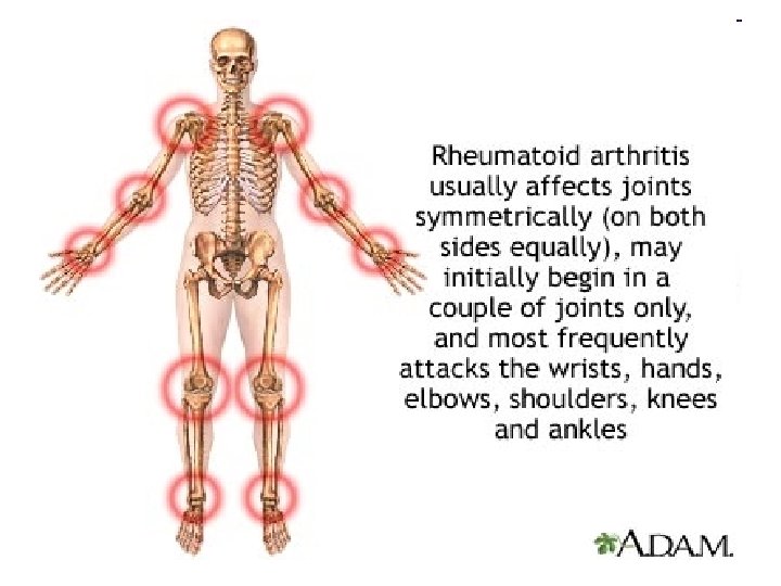 Cont … Involved joints : – Swollen – Warm – Painful – Particularly stiff on arising or following inactivity