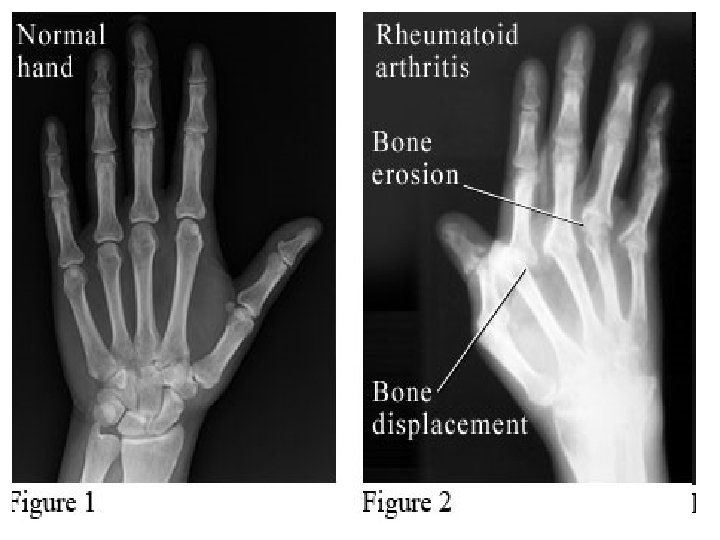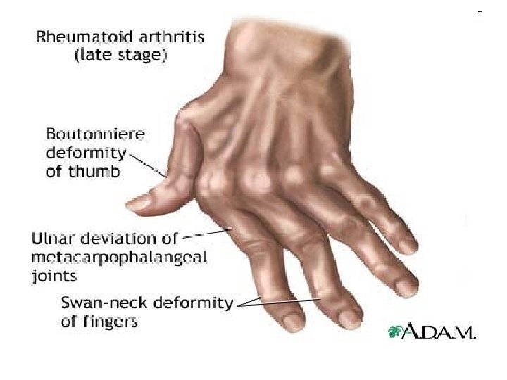 Radiology: – – – – Show soft tissue swelling, periarticular osteopenia, loss of joint space, erosions Deformity Radial deviation of the wrist Ulnar deviation of the fingers – Swan neck deformity ( flexon – hyperextension deformity ).