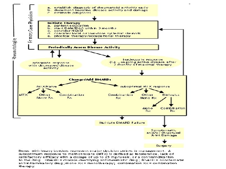 Cont. . Biologic Response Modifiers – • • directly modify the immune system by inhibiting proteins called cytokines, which contribute to inflammation. Examples abatacept, etanercept, infliximab, adaliumumab and anakinra. Protein-A Immuonoadsorption Therapy (dialysis-like technique) • This is not a drug, but a therapy that filters blood to remove antibodies and immune complexes that promote inflammation. DMARDs, particularly methotrexate, have been the standard for aggressively treating RA. • Recently, studies have shown that the most aggressive treatment for controlling RA may be the combination of methotrexate and another drug, particularly biologic response modifiers. • The dual drug treatment seems to create a more effective treatment, especially for people who may not have success with or who have built up a resistance to, methotrexate or another drug alone. • Combination with methotrexate: lefluonomide (Arava), etanercept (Enbrel), adalimumab (Humira) and infliximab (Remicade
