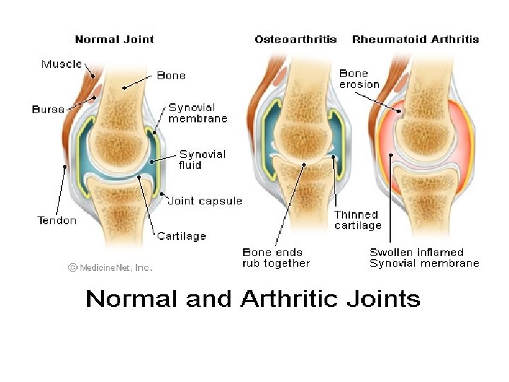 * Pathophysiology: • Unknown antigen stimulates CD 4+ T lymphocytes. • Active CD 4+ T lymphocytes; a. stimulates macrophages to release IL 1 and TNF. b. Release RANKL which stimulates osteoclasts leading to bone destruction. • IL-1 and TNF stimulates synovial cells leading to: a. Synovial cell proliferation and formation of pannaus. b. Production of prostaglandins (pain sensation) and matrix metalloproteinases that cause cartilage destruction.