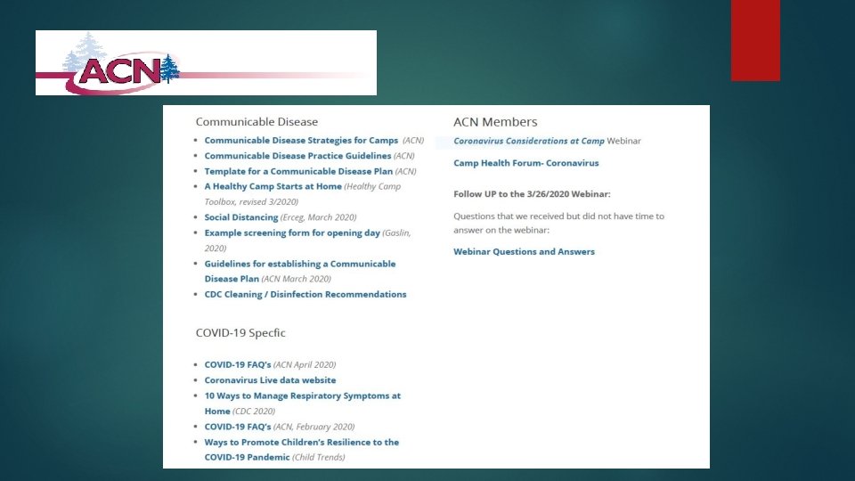 Contact: Association of Camp Nursing COVID-19 Resource Page 502. 830. 8393 acn@campnurse. org www. campnurse. org