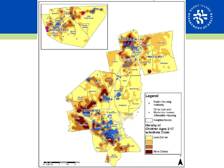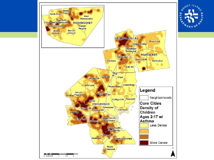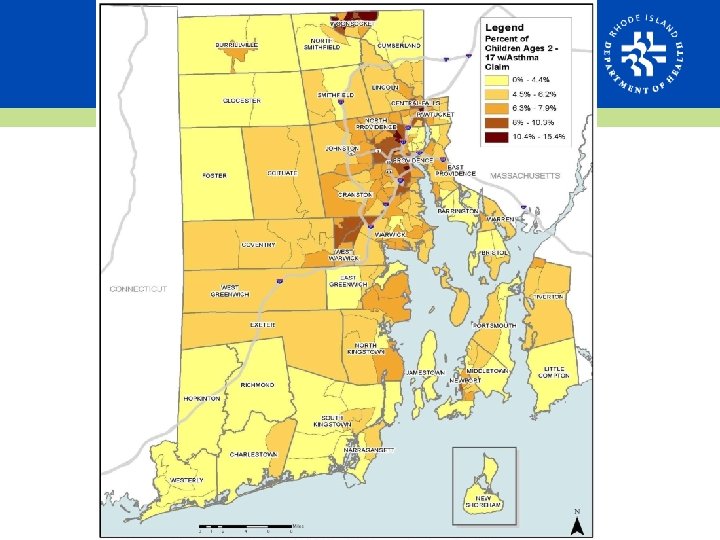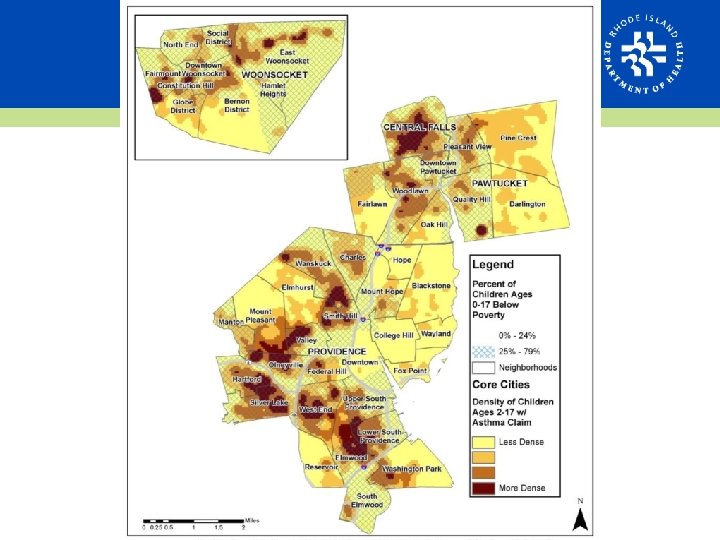Asthma and Poverty • Asthma prevalence significantly higher in adults with an annual income less than $25, 000 • The highest rates of poverty in RI cluster in urban areas • Highest childhood poverty rates up to 79%