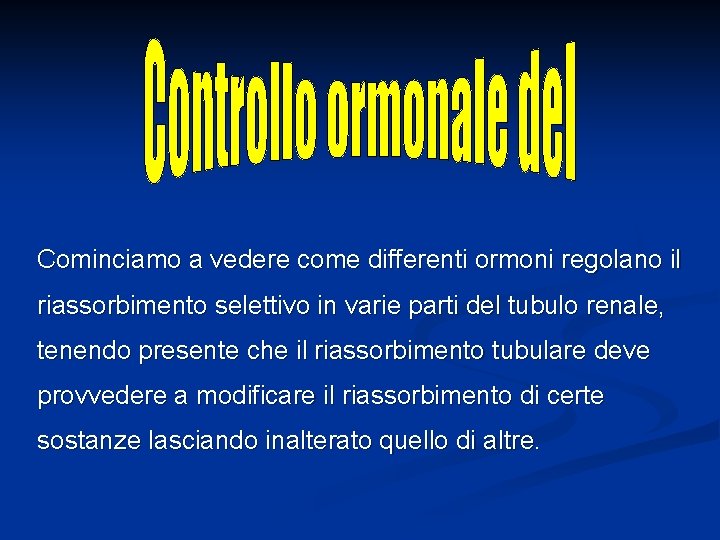 Cominciamo a vedere come differenti ormoni regolano il riassorbimento selettivo in varie parti del tubulo renale, tenendo presente che il riassorbimento tubulare deve provvedere a modificare il riassorbimento di certe sostanze lasciando inalterato quello di altre.