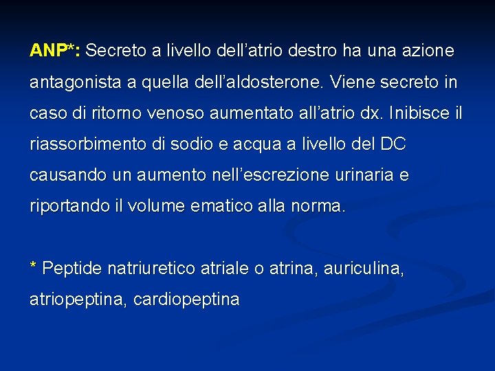 ANP*: Secreto a livello dell’atrio destro ha una azione antagonista a quella dell’aldosterone. Viene secreto in caso di ritorno venoso aumentato all’atrio dx. Inibisce il riassorbimento di sodio e acqua a livello del DC causando un aumento nell’escrezione urinaria e riportando il volume ematico alla norma. * Peptide natriuretico atriale o atrina, auriculina, atriopeptina, cardiopeptina
