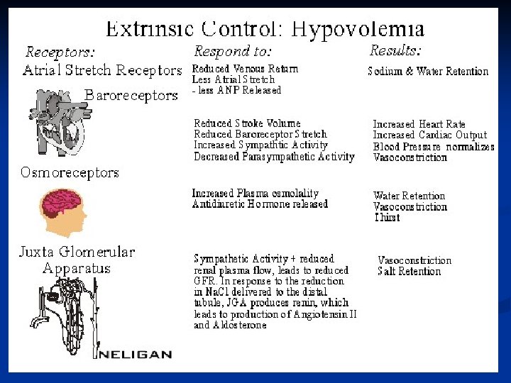 L’ipovolemia, conseguente a fatti più o meno traumatici, riduce il ritorno venoso al cuore generando i seguenti fatti: • riduzione di ANP conseguente aumento nel riassorbimento di Na+ e acqua. • produzione di ADH per riassorbire acqua nel nefrone distale (osmocettori) • caduta di pressione arteriosa per riduzione della gittata cardiaca.