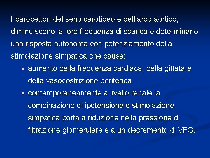 I barocettori del seno carotideo e dell’arco aortico, diminuiscono la loro frequenza di scarica e determinano una risposta autonoma con potenziamento della stimolazione simpatica che causa: § aumento della frequenza cardiaca, della gittata e della vasocostrizione periferica. § contemporaneamente a livello renale la combinazione di ipotensione e stimolazione simpatica porta a riduzione nella pressione di filtrazione glomerulare e a un decremento di VFG.