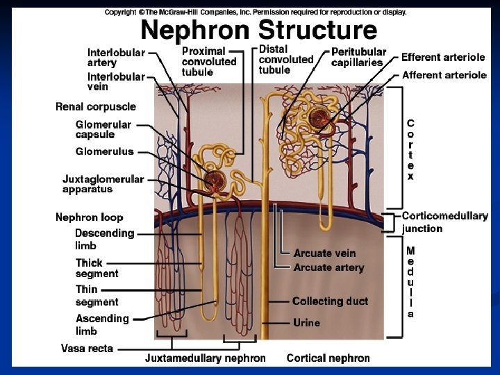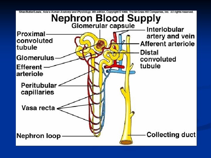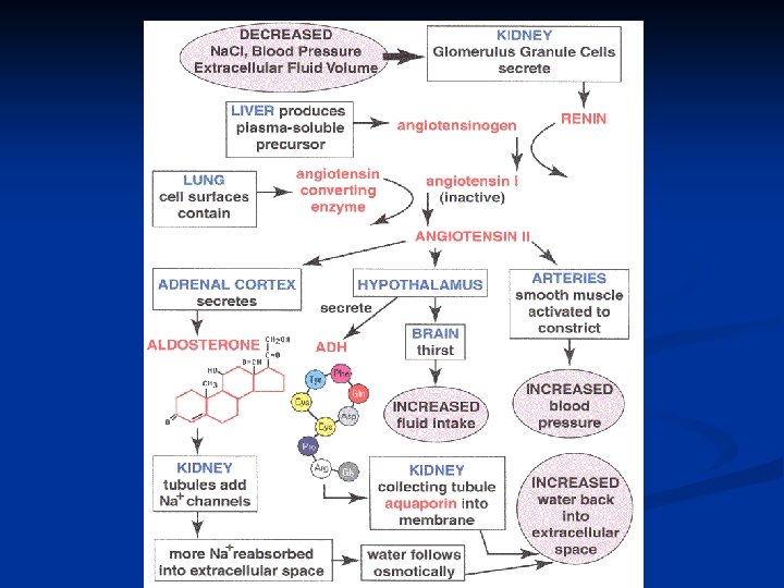 Effetto di ormoni sul riassorbimento nelle diverse parti del nefrone Ormone Sito d’azione Effetti Aldosterone TCD / DC Angiotensina II TCP ↑ riassorbimento di H 2 O e Na. Cl ↑ secrezione di K+ ↑ riassorbimento di H 2 O, Na. Cl ↑ secrezione di H+ ADH TCD / DC ↑ riassorbimento di H 2 O ANP TCD / DC ↓ riassorbimento di Na. Cl PTH TCP, TAS, TCD ↓ riassorbimento di PO 43↑ riassorbimento di Ca 2+