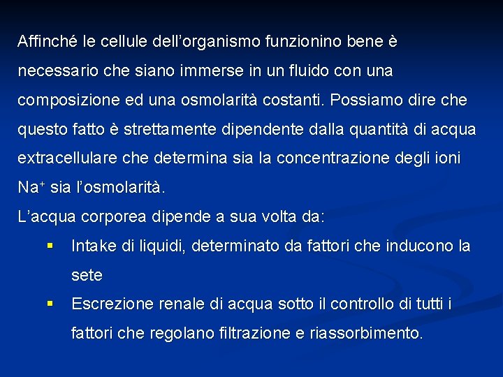 Affinché le cellule dell’organismo funzionino bene è necessario che siano immerse in un fluido con una composizione ed una osmolarità costanti. Possiamo dire che questo fatto è strettamente dipendente dalla quantità di acqua extracellulare che determina sia la concentrazione degli ioni Na+ sia l’osmolarità. L’acqua corporea dipende a sua volta da: § Intake di liquidi, determinato da fattori che inducono la sete § Escrezione renale di acqua sotto il controllo di tutti i fattori che regolano filtrazione e riassorbimento.