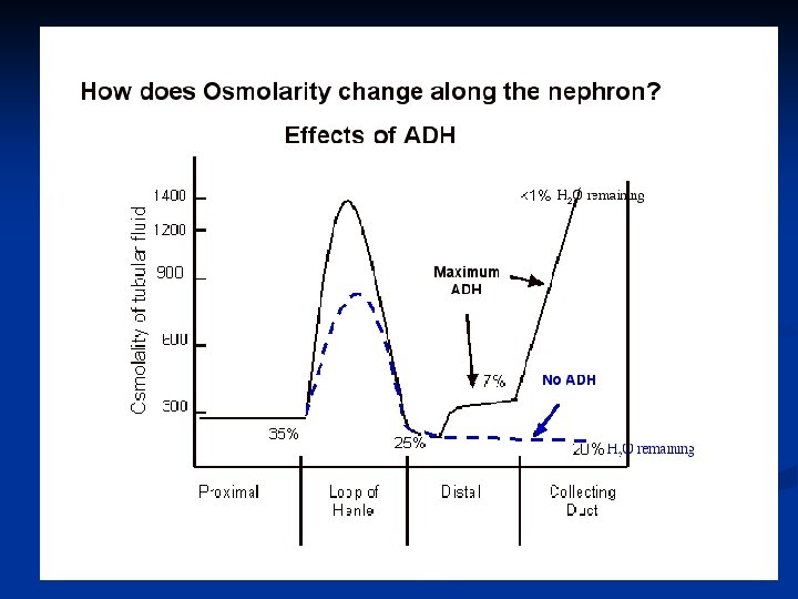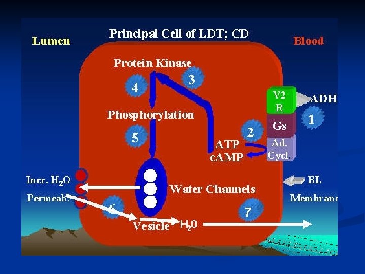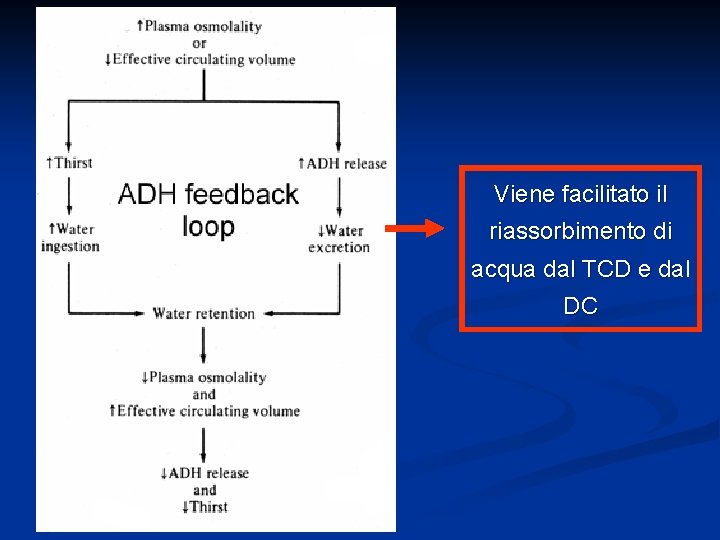 Quando il fluido tubulare lascia l’AH per immettersi nel nefrone distale, è diluito con un’osmolaritá di circa 100 m. Osm/l. Quando il fluido passa nella seconda metá del TCD e nel DC la quantitá di acqua che viene riassorbita dipende dall’ADH presente. Se ADH è presente in significativa concentrazione, l’acqua viene riassorbita dal fluido tubulare nei capillari peritubulari.