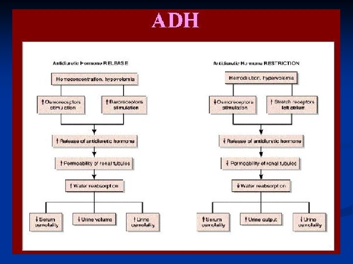 ADH: La sua azione più importante è quella di permeabilizzare il nefrone distale all’acqua per risparmiarla in caso di necessità. Ha un ruolo fondamentale nella produzione di urine diluite o urine concentrate.