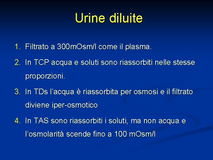 Urine diluite 1. Filtrato a 300 m. Osm/l come il plasma. 2. In TCP acqua e soluti sono riassorbiti nelle stesse proporzioni. 3. In TDs l’acqua è riassorbita per osmosi e il filtrato diviene iper-osmotico 4. In TAS sono riassorbiti i soluti, ma non acqua e l’osmolarità scende fino a 100 m. Osm/l
