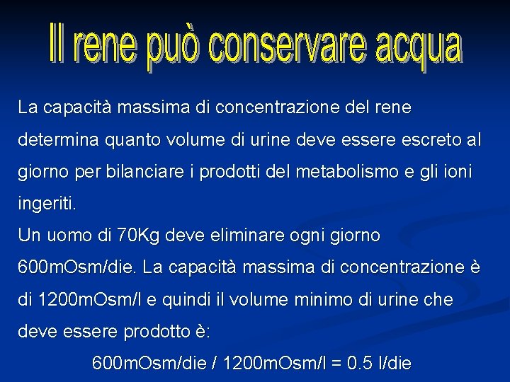 La capacità massima di concentrazione del rene determina quanto volume di urine deve essere escreto al giorno per bilanciare i prodotti del metabolismo e gli ioni ingeriti. Un uomo di 70 Kg deve eliminare ogni giorno 600 m. Osm/die. La capacità massima di concentrazione è di 1200 m. Osm/l e quindi il volume minimo di urine che deve essere prodotto è: 600 m. Osm/die / 1200 m. Osm/l = 0. 5 l/die