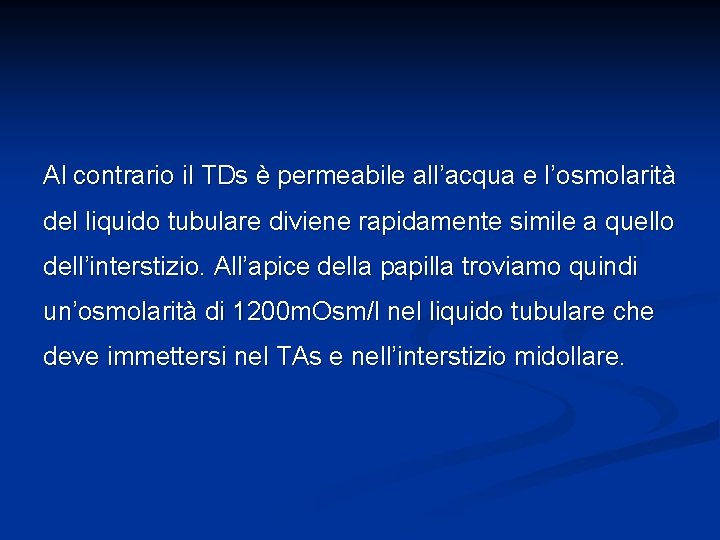Al contrario il TDs è permeabile all’acqua e l’osmolarità del liquido tubulare diviene rapidamente simile a quello dell’interstizio. All’apice della papilla troviamo quindi un’osmolarità di 1200 m. Osm/l nel liquido tubulare che deve immettersi nel TAs e nell’interstizio midollare.