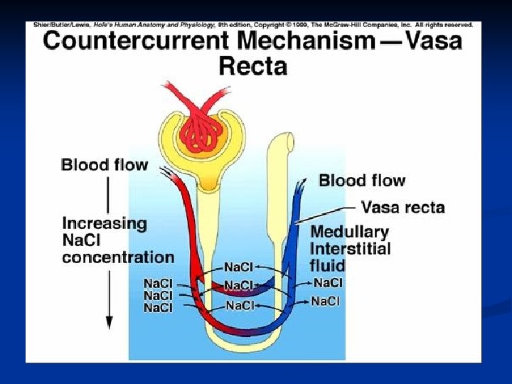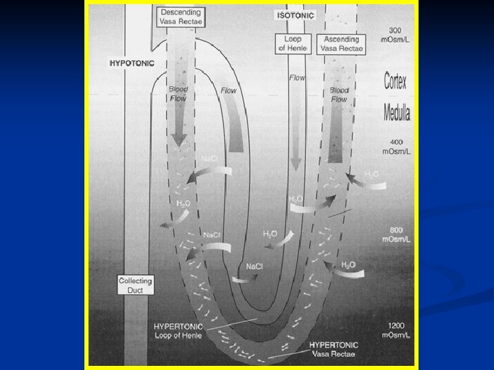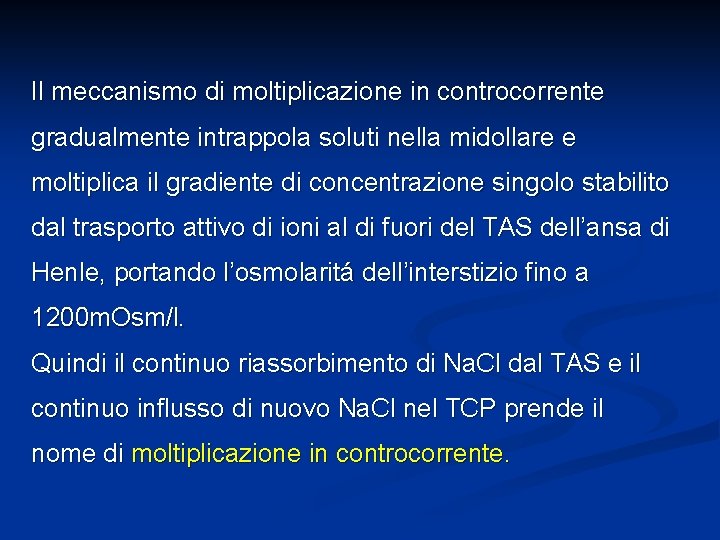 Il meccanismo di moltiplicazione in controcorrente gradualmente intrappola soluti nella midollare e moltiplica il gradiente di concentrazione singolo stabilito dal trasporto attivo di ioni al di fuori del TAS dell’ansa di Henle, portando l’osmolaritá dell’interstizio fino a 1200 m. Osm/l. Quindi il continuo riassorbimento di Na. Cl dal TAS e il continuo influsso di nuovo Na. Cl nel TCP prende il nome di moltiplicazione in controcorrente.