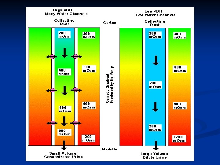 IL FATTO CHE LA MAGGIOR PARTE DEL RIASSORBIMENTO AVVENGA NELLA PARTE CORTICALE AIUTA A PRESERVARE L’OSMOLARITÁ DELL’INTERSTIZIO MIDOLLARE. All’uscita del DC l’urina può arrivare ad una osmolaritá di 1200 m. Osm/l. Quindi, riassorbendo piú acqua possibile i reni formano urine concentrate, eliminando normali quantitá di soluti.