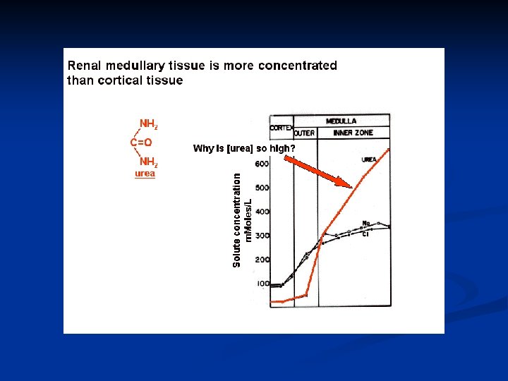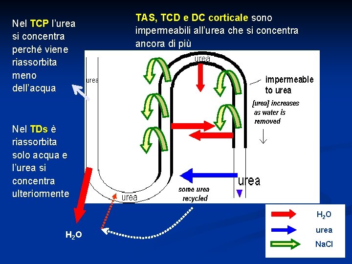 Nel TCP l’urea si concentra perché viene riassorbita meno dell’acqua TAS, TCD e DC corticale sono impermeabili all’urea che si concentra ancora di più Nel TDs è riassorbita solo acqua e l’urea si concentra ulteriormente H 2 O urea Na. Cl