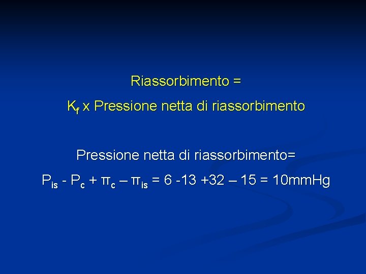 Riassorbimento = Kf x Pressione netta di riassorbimento= Pis - Pc + πc – πis = 6 -13 +32 – 15 = 10 mm. Hg