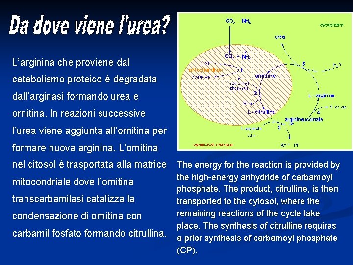 L’arginina che proviene dal catabolismo proteico è degradata dall’arginasi formando urea e ornitina. In reazioni successive l’urea viene aggiunta all’ornitina per formare nuova arginina. L’ornitina nel citosol è trasportata alla matrice mitocondriale dove l’ornitina transcarbamilasi catalizza la condensazione di ornitina con carbamil fosfato formando citrullina. The energy for the reaction is provided by the high-energy anhydride of carbamoyl phosphate. The product, citrulline, is then transported to the cytosol, where the remaining reactions of the cycle take place. The synthesis of citrulline requires a prior synthesis of carbamoyl phosphate (CP).