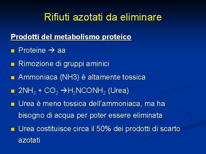 Rifiuti azotati da eliminare Prodotti del metabolismo proteico n Proteine aa n Rimozione di gruppi aminici n Ammoniaca (NH 3) è altamente tossica n 2 NH 3 + CO 2 H 2 NCONH 2 (Urea) n Urea è meno tossica dell’ammoniaca, ma ha bisogno di acqua per poter essere eliminata n Urea costituisce circa il 50% dei prodotti di scarto azotati