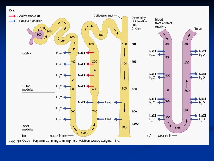 TAs: Impermeabile all’acqua, ma permeabile ai soluti (Na. Cl). Na. Cl è molto concentrato nel liquido tubulare e quindi diffonde nell’interstizio. Una piccola quantità di urea diffonde dall’interstizio midollare nel liquido tubulare e viene rimessa in circolo nel nefrone. TAS: Impermeabile all’acqua, ma Na. Cl, KCl e altri ioni sono ATTIVAMENTE trasportati nell’interstizio. Il liquido si diluisce e raggiunge un’osmolarità di 100 m. Osm/l.