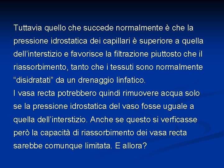 Tuttavia quello che succede normalmente è che la pressione idrostatica dei capillari è superiore a quella dell’interstizio e favorisce la filtrazione piuttosto che il riassorbimento, tanto che i tessuti sono normalmente “disidratati” da un drenaggio linfatico. I vasa recta potrebbero quindi rimuovere acqua solo se la pressione idrostatica del vaso fosse uguale a quella dell’interstizio. Anche se questo si verficasse però la capacità di riassorbimento dei vasa recta sarebbe comunque limitata. E allora?