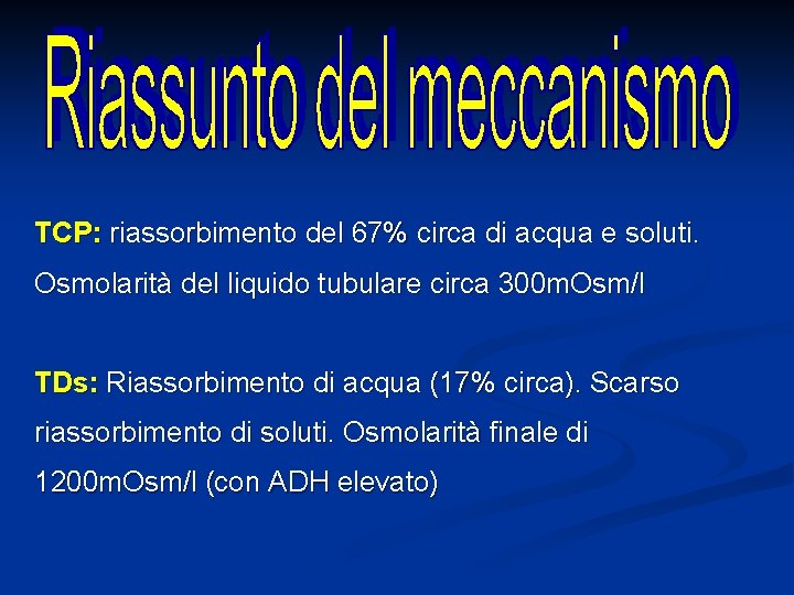 TCP: riassorbimento del 67% circa di acqua e soluti. Osmolarità del liquido tubulare circa 300 m. Osm/l TDs: Riassorbimento di acqua (17% circa). Scarso riassorbimento di soluti. Osmolarità finale di 1200 m. Osm/l (con ADH elevato)