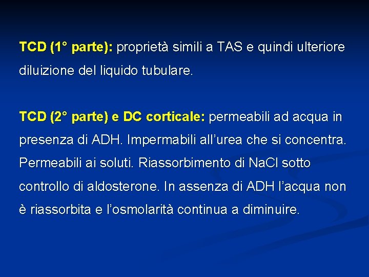 5. Quindi, INDIPENDENTEMENTE dal fatto che vi sia o no ADH, il liquido che lascia la primissima parte del TCD è ipo-osmotica rispetto al plasma. 6. Nella seconda parte del TCD e nel DC in assenza di ADH sono riassorbiti soltanto soluti, ma non acqua e quindi saranno prodotti grossi volumi di urine diluite.