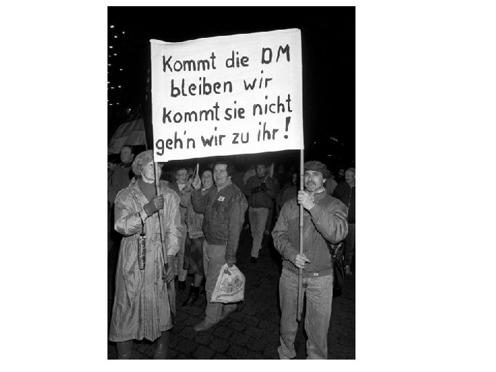 Was tun? • Täglich verlassen zwei bis dreitausend Menschen die DDR! • Kohl: • „Es geht jetzt darum, ein klares Signal der Hoffnung und der Ermutigung für die Menschen in der DDR zu setzen […] Für die Bundesrepublik Deutschland […] bedeutet das, daß wir damit unseren stärksten wirtschaftlichen Aktivposten einbringen: Die Deutsche Mark. Wir beteiligen so die Landsleute in der DDR ganz unmittelbar und direkt an dem, was die Bürger der Bundesrepublik Deutschland in jahrzehntelanger beharrlicher Arbeit aufgebaut und erreicht haben. “