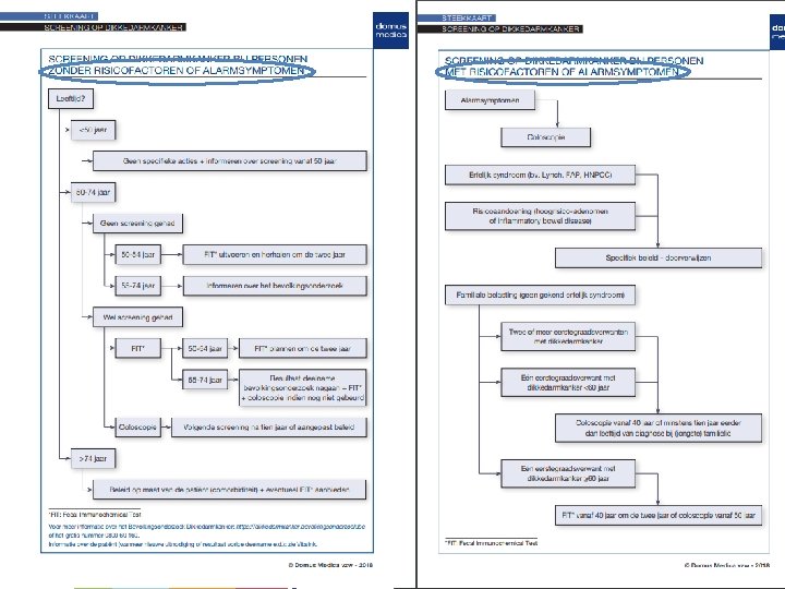 Casus 2: hoog risicoprofiel: doorsturen voor coloscopie Alarmsymptomen bloed of slijm in de stoelgang • Verandering in stoelgangspatroon • tijdsduur Familiale erfelijke risico aandoening Lynch FAP HNPCC Persoonlijke risico aandoening Poliep (hoog risico) IBD (>8 j) Coloscopie Geen FIT Specifiek beleid in overleg met specialist