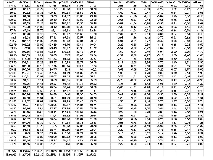 CP 1= 0. 196(sicuro)+0. 204(deciso)+0. 2(forte)+0. 212(socievole)+0. 096(preciso)+ 0. 111(metodico)+0. 22(attivo) CP 2= -0. 207(sicuro)-0. 241(deciso)-0. 15(forte)-0. 002(socievole)+0. 526(preciso)+ 0. 492(metodico)+0. 069(attivo)
