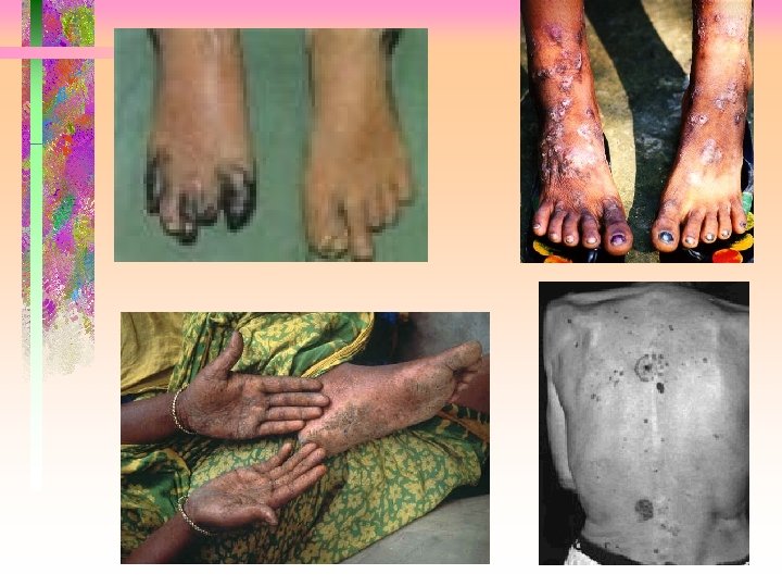 DIFERENCIAS REGIONALES MEXICO: CHILE : PERFORACION TABIQUE NASAL ANOREXIA, DIARREAS, LESIONES VASCULARES ACRALES Y SISTEMICAS. HEPATOESPLENOMEGALIA CIRROSIS HEPATICA TAIWAN: MELANODERMIA CON LESIONES VASCULARES EN PIES (PIES NEGROS) ARGENTINA: QUERATODERMIA CARCINOMAS MULTIPLES EN ZONAS NO EXPUESTAS(TRONCO)