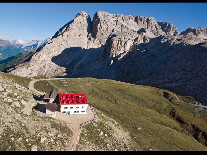 Grupul muntos Catinaccio d´Antermoia – Rosengarten In pps-ul trecut v-am prezentat ocolirea Masivului Rosengarten cu refugiile ei. Astazi intram in regiunea Catinaccio d´Antremoia. Plecam dis de dimineata, pe vreme frumoasa, de la refugiul Gardeccia spre Rif. Vajolet. Facem o mica pauza inainte de a incepe urcusul spre Rif. Passo Principe Grasleitenpasshütte la o altitudine de 2601 - aici vine si drumul de la Rif. Bergamo al Principe si Rif. Alpe de Tires. De aici , mereu sub peretii impozanti ai varfului Catinaccio, in coboras usor ne indreptam spre Rif. si lacul d´Antermoia 2497 m. . Pauza de pranz. Ne intoarcem pe acelas drum, sau urcand pe vf. Cima Scalieret 2887 m. apoi coborand in Passo delle Pope sre Rif. Vajolet si apoi Rif, Gardeccia de unde am plecat azi de dimineata. Tura ne ia „o zi lumina“ Rif. d´Antermoia Rif. Santnerpass Rif. Re. Alberto I Rif. Roda di Vael