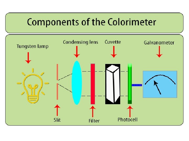 COMPONENT OF COLORIMETER Light source Slit Monochromator(filter) Cuvette Photocell Galvanometer