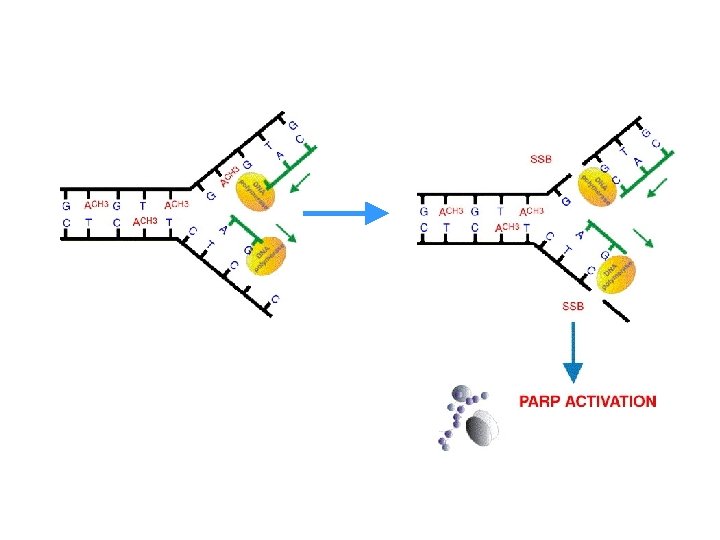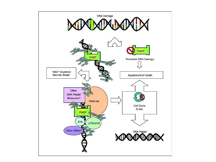 PARP-1 è un enzima chiave nella riparazione di single-strand DNA breaks DNA damage PAR chains are degraded via PARG PARP Binds directly to SSBs Repaired DNA NAD+ Nicotinamide +p. ADPr Repair enzymes PAR Once bound to damaged DNA, PARP modifies itself producing large branched chains of PAR