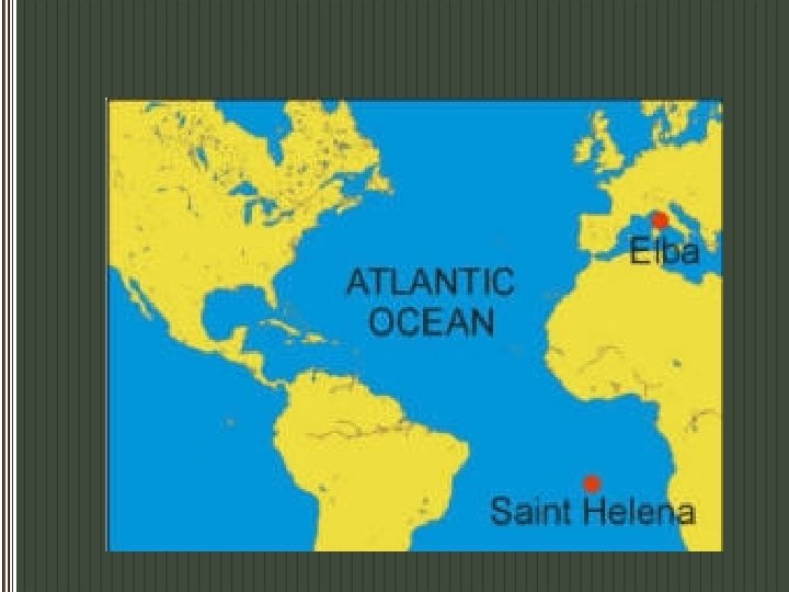 Into Exile (More of a vacation really) p Napoleon’s enemies (England, Russia, Austria, Prussia, and Sweden) attack while Napoleon is weak. • Battle of Leipzig (1813) • April, 1814 – Napoleon gives up his throne and is sent into exile on the island of Elba.