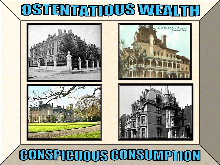 • The wealthy showed off their wealth and were snobbish and stuck up……. Ostentatious wealth or conspicuous consumption • Time of corruption, scandals in local, state and national government. • President Grant’s scandals • Election of 1876 • William Boss Tweed • President Garfield’s assassination