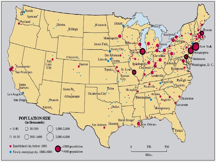 • In 1860 no American city could boast a million inhabitants. • 1890, New York, Chicago and Philadelphia had spurted past the million mark. Cities