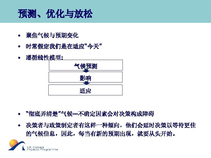 Predict, Optimise and Relax • Focus is on the climate and projected changes • Often assumes that we are adapted to “today” • Follows a linear model: • Climate Projections • Impacts • Adaptation • Focus is on getting the climate “right” – uncertainty remains a barrier to decision making • Tendency for decision and policy makers to hold off awaiting better climate information and there is a need to start over each time there is new projections