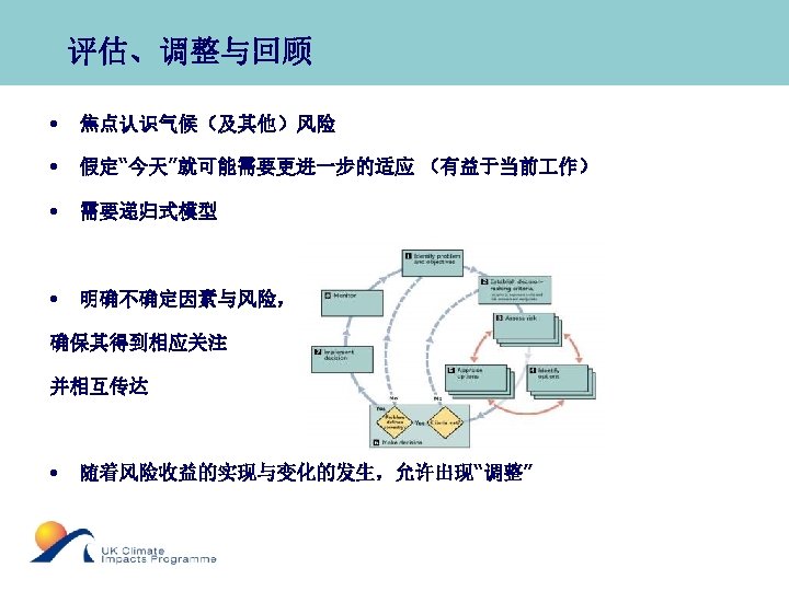 Assess, Adjust and Review • Focus is on understanding the climate (and other) risks • Assumes that “today” may need some further adaptation (benefits the day job) • Recognises the need for a recursive model • Uncertainty and risk are made explicit and addressed and can be communicated • Allows for “adjustments” as benefits and changes in risk are realised